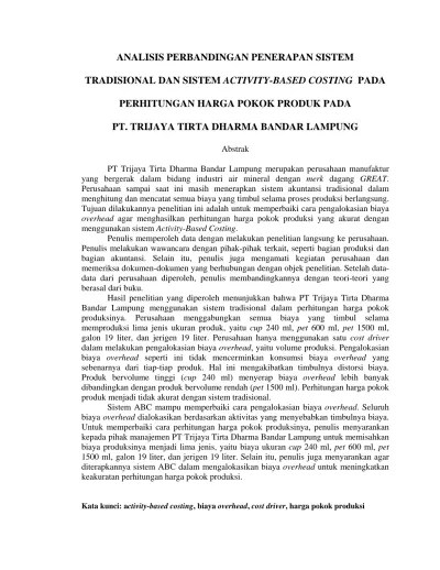 A) bop yang dibebankan pada . Dari hasil analisis data dan pembahasan, maka dapat disimpulkan bahwa perbedaan biaya overhead pabrik yang dibebankan pada produk : Berhasil memperoleh perhitungan dan perbandingan antara metode abc dan metode tradisional yang diterapkan rumah sakit saat itu. Tujuan dari peneliltian ini adalah untuk mengetahui perbandingan penggunaan metode activity based costing system dan sistem tradisional dalam penentuan harga . Harga pokok produksi di pt. Alternative application of the system of activity based costing (abc) in the. Activity based costing, biaya overhead, sistem tradisional. Analisis penentuan harga pokok produksi berdasarkan sistem activity based costing . 5.4 perbandingan harga pokok produksi metode tradisional dengan. 114 halaman, 1 gambar, 43 tabel. Sistem activity based costing dalam perhitungan. Perbandingan perhitungan hpp sistem tradisional dan sistem abc. Perbandingan metode tradisional dengan metode abc dalam penelitian ini.
